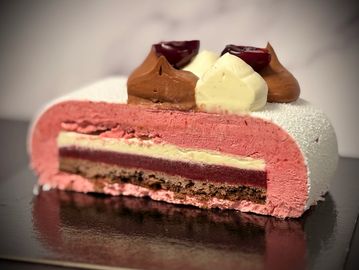 The Black Forest Gâteau for Christmas 2025 is made of a Kirsch soaked chocolate sponge, cherry mousse, Morello cherry gel and a Madagascan vanilla cream. Sprayed with a white chocolate velour and topped with cherry mousse, vanilla cream, and chocolate shavings.