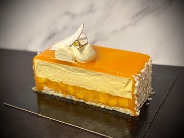 A taste of the tropics at Christmas. Coconut sponge, mango and passionfruit compote, orange marmalade & vanilla mousse, tropical glaze. Topped with a whipped vanilla ganache, fresh coconut and passionfruit gel.